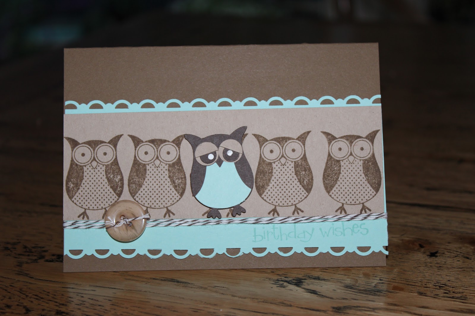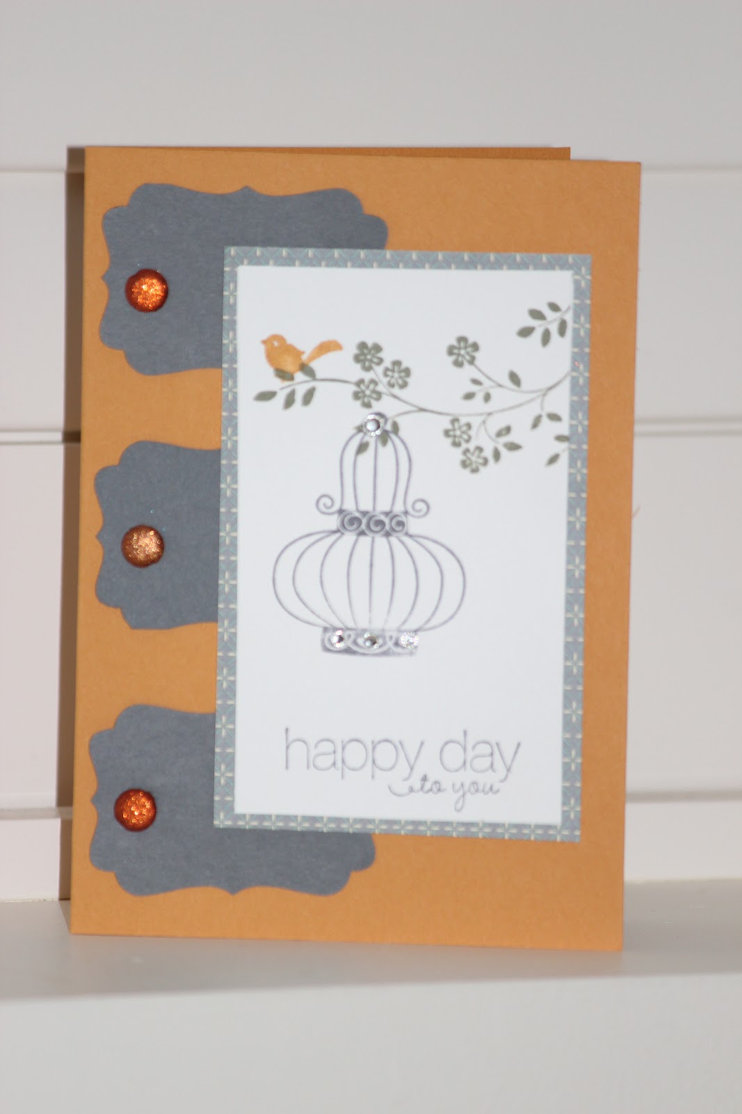 Using the Decorative label punch to cut the three shapes for the left side of the sketch, I also added a Glimmer Brad to each. A layer of Domestic Goddess paper in grey was placed under the Whisper White with the stamped images, including the Happy Day to you greeting from stamp set Friendly Phrases. The branch is the Thoughts and Prayers Stamp set. So just a simple little card, using a clean and simple plan. Forgot to add, it hasn't caught them very well in my night time photo but there is a row of 3 rhinestones on the bottom of the cage and a slightly bigger rhinestone up the top.