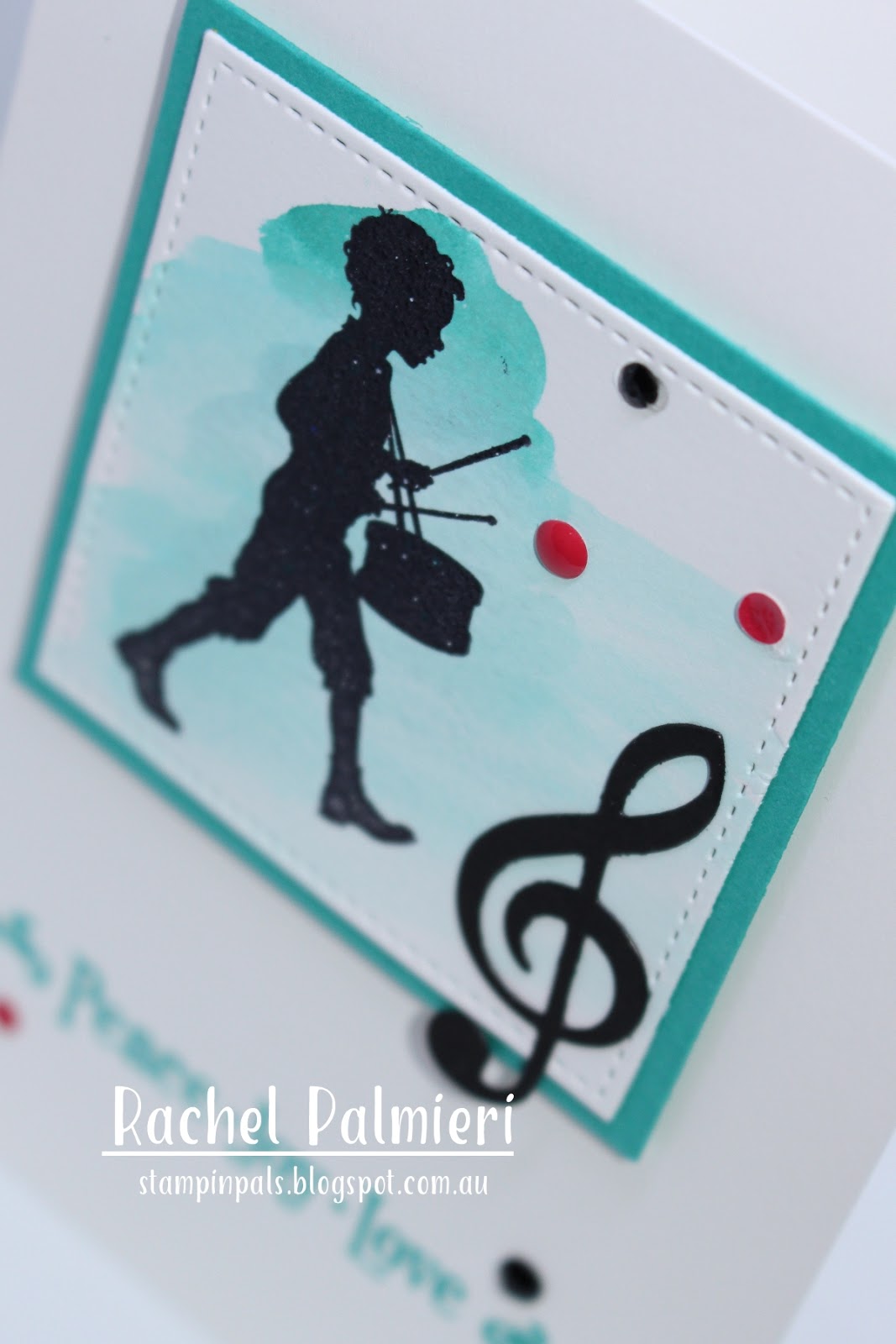 Inspiration for my cards came from the catalogue but I tried to put my own spin on it. I stamped the drummer boy in black ink and poured clear embossing powder over before heat setting. Bermuda Bay was washed over the background, and the piece was cut with a Stitched Framelit square, and a larger square was laid behind. It is a simple design, and quite easy to put together. Clean and layered (like this) is my preferred style.